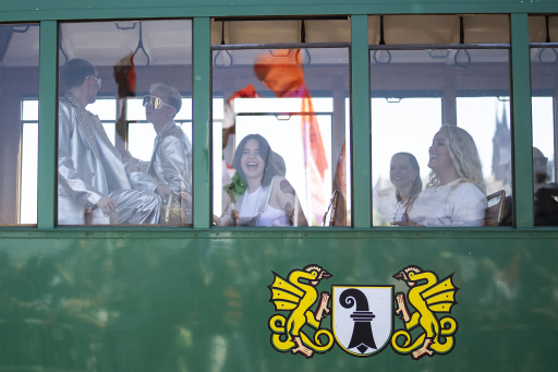 Bei der Parade kutschierten Oldtimer-Trams und -Busse die Delegationen ins Kleinbasel. Dazu gab es eine farbenfrohe Begleitung: Basler Fasnachtscliquen mit Trommeln und Piccolos, Guggenmusiken, Alphornspieler, Tanzgruppen, Schulklassen und Techno-Acts zogen durch die Stadt.