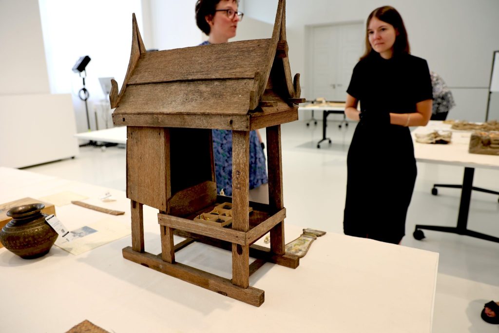 Bei den meisten dieser Objekte, wie etwa bei dem Opferschreinhäuschen aus Thailand, ist der Vermerk «mitgenommen» zu finden. Wie freiwillig dieses «Mitnehmen» zum Teil vonstattenging, ist Teil der Forschungsarbeit.