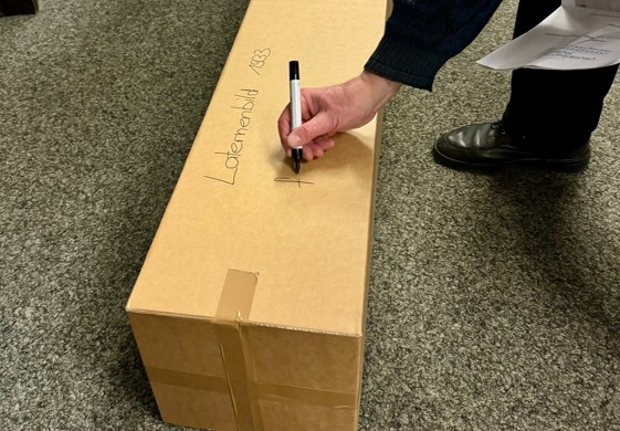 Die alte Leinwand liegt ausgebreitet am Boden. Mit ihrer Grösse füllt sie den Raum im Keller der Alten Stainlemer gut aus. Erstaunlich satt sind die Farben, nur der obere Rand ist etwas eingerissen. Der Vereinsarchivar und ein Cliquen-Kollege machen das Laternenbild transportfertig. Sie polstern es aus, rollen es ein und verpackten es fachgerecht in einer Kartonschachtel. Seine längste Reise überhaupt steht bevor: über 600 Kilometer in die Niederlande.