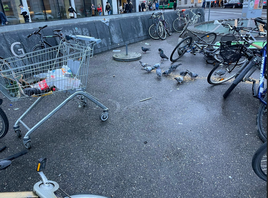 Wo früher manch einer für ein kurzes Päuschen in der Sonne sass oder sich die Bahnhofscommunity zum Bier versammelte, stehen heute teilweise verwaiste Velos. Das Rundfenster vor dem Hotel Victoria ist zum öffentlichen Scheissplatz für die Basler Stadttauben verkommen.
