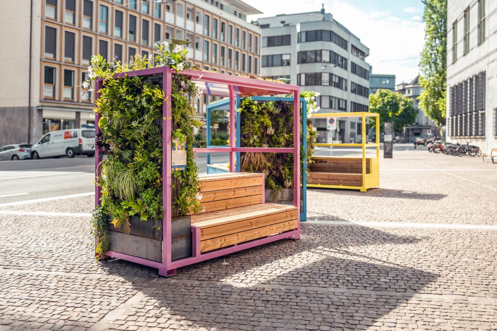 Bis im Oktober laden an drei Orten begrünte, schattenspendende Stadt-Inseln zum Hinsetzen und Innehalten ein – und dank Solarstrom kannst du auch gleich noch dein Handy aufladen.