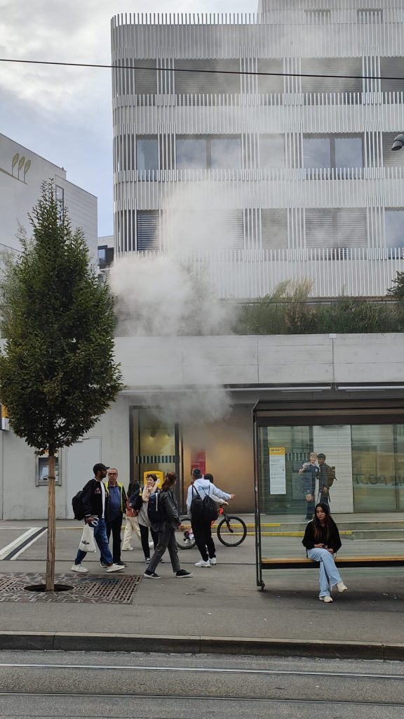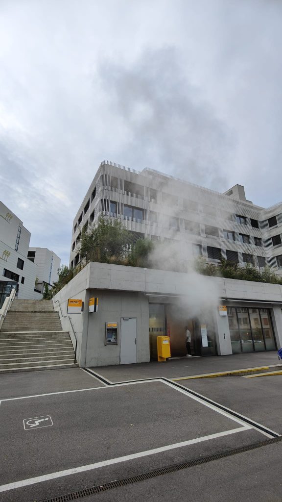 Beim Rauch handelt es sich um Nebel. Genauer gesagt ist dies eine neue Sicherheitsvorkehrung der Post, die mit dem neuen Erscheinungsbild zusammenhängt. «Dazu gehören offene Schalter ohne Glas zwischen der Kundschaft und Personal und ein Verzicht auf vergitterte Fenster», erklärt Markus Flückiger von der Schweizerischen Post. Dieser neue visuelle Auftritt erfordere angepasste Sicherheitsvorkehrungen.