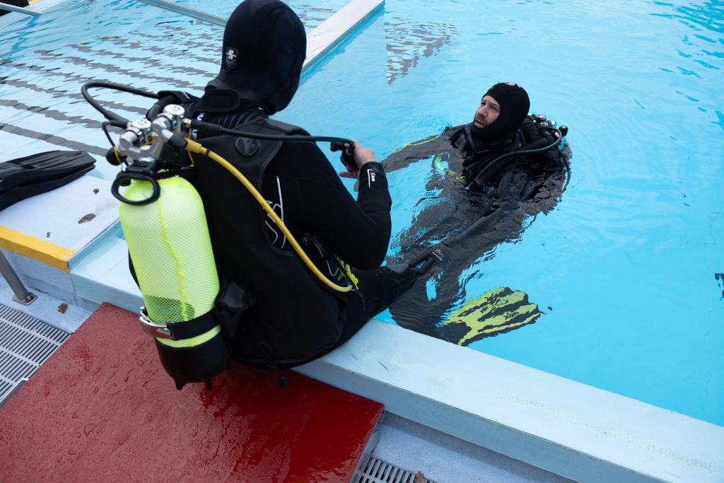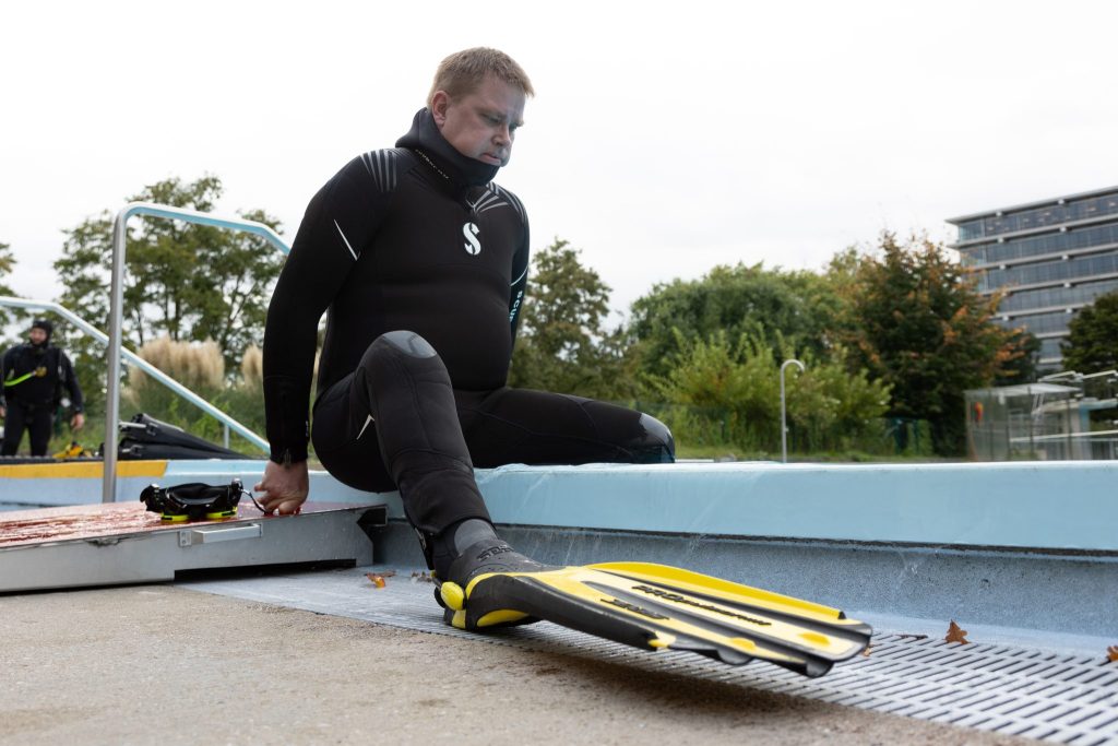 Auf Kreta oder am Vierwaldstättersee war Corsten schon tauchen. An diesem Tag jedoch heisst das Gewässer Gartenbad Bachgraben. Seit Anfangs Oktober ist das Freibad für die Öffentlichkeit geschlossen, einzig für den Tauchkurs steht es zur Verfügung. Neoprenanzug, Kopfhaube und Schwimmflossen werden angelegt – zusammen mit den Tauchflaschen kommen dabei gut und gerne über 20 Kilogramm zusammen. Mit zwei Begleitpersonen geht es dann für Corsten ins Schwimmerbecken, dessen Wassertemperatur etwa 17 Grad beträgt.