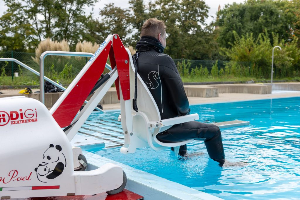 Über eine eigens angefertigte Rampe geht es ins Wasser, der Daumen zeigt nach unten: Es ist das ist das Zeichen zum Abtauchen. Corsten taucht nun 100 Meter, also rund zwei Bahnen lang. «Ein Moment der Freiheit», beschreibt er den Moment. Das schwerelose Schweben hilft ihm abzuschalten. In der Ruhe unter Wasser vergisst er für eine Zeit lang sein Handicap, vergisst die Bewegungsbeschwerden im Alltag. «Es ist wie das Gefühl von Schweben, von dem man im Schlaf träumt», schwärmt er über den Moment. Nach den zwei Längen ist wieder Schluss.