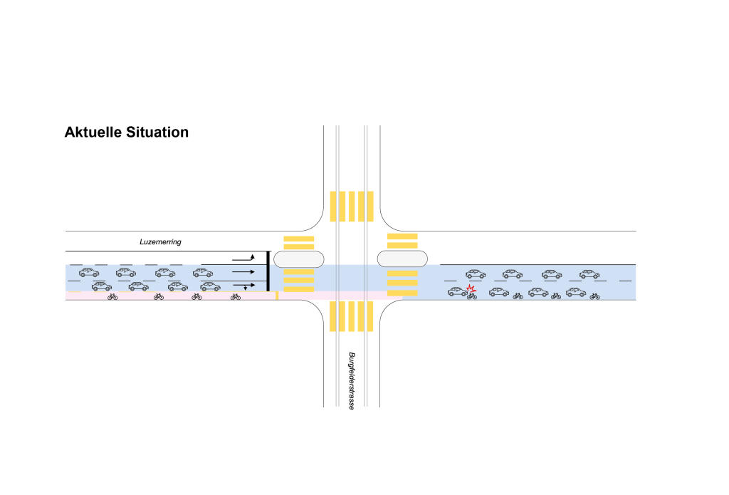 Er ist ein Unfall-Hotspot auf Basels Strassen: der Luzernerring. Besonders heikel ist die Kreuzung mit der Burgfelderstrasse. Wenn du mit dem Velo in Richtung St. Johann unterwegs bist, hast du bis zur Kreuzung noch einen Velostreifen zur Verfügung. Dann ist aber Schluss. Nach der Kreuzung teilst du dir die Strasse mit Autos und Bus – und das wird ziemlich eng.