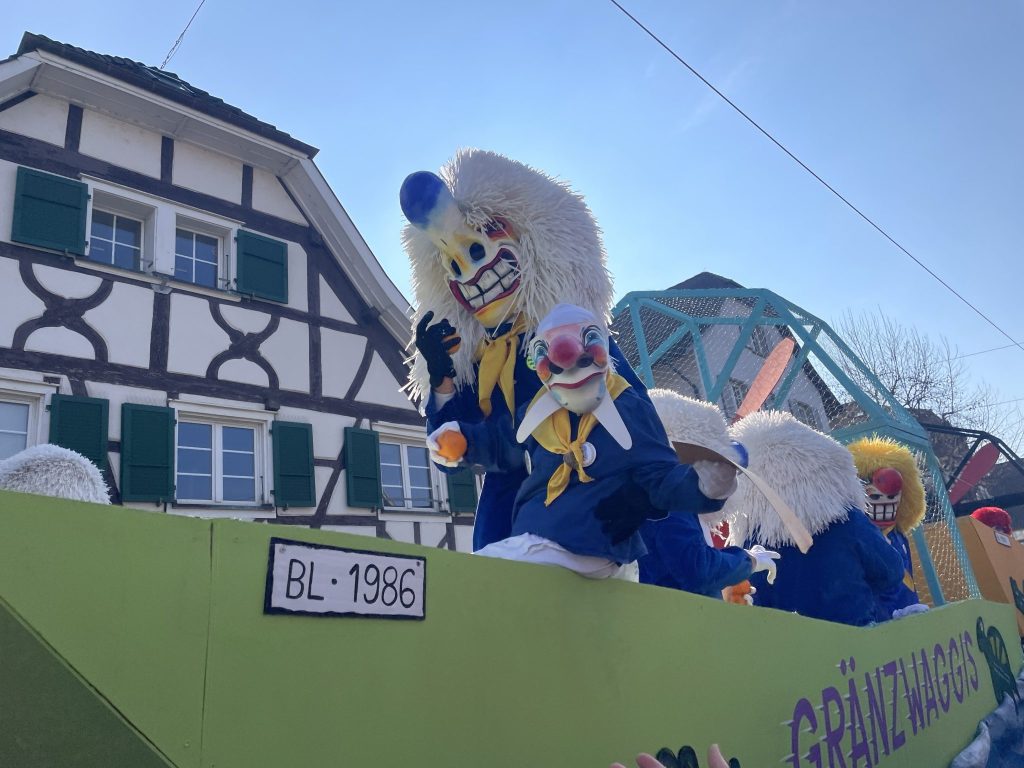 Rund 1200 aktive Fasnächtler:innen ziehen an diesem sonnigen Sonntagnachmittag durch die Gemeinde. Die Schwellheimer Fasnacht gehört zu den grösseren im Baselbiet.