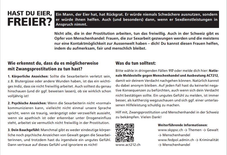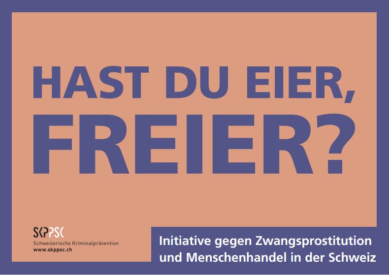 Seit Herbst 2021 werden in Basel die Konsumenten von Prostitution in die Pflicht genommen. Die Kampagne «Hast du Eier, Freier?» zielt bewusst darauf ab, das Bewusstsein von Freiern für allfällige Missstände in der Prostitution zu schärfen. Hat eine Sexarbeiterin eine Wunde? Äussert sie sich vielleicht sogar über Missstände? In solchen Fällen ist eine anonyme Meldung über die entsprechende Webseite möglich.