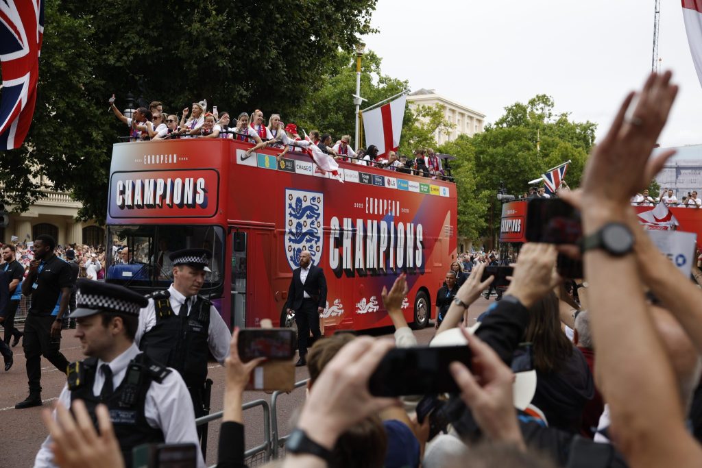 Englands Fussballerinnen feiern die erfolgreiche Titelverteidigung an der Europameisterschaft bei einer Parade in London mit ihren Fans.