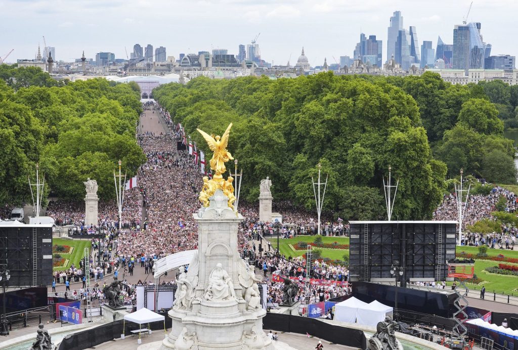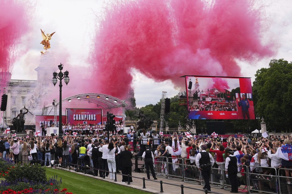 Am Ende der Parade wurden die Europameisterinnen auf einer Bühne direkt vor dem Buckingham-Palast empfangen, wo sie den Fans unter grossem Jubel die EM-Trophäe präsentierten. Die Sängerin Heather Smalls von der Band M People sang das Lied «Proud», die Spielerinnen sangen mit und tanzten dazu. Während des Turniers in der Schweiz hatte das Team den Song vor den Spielen regelmässig in der Kabine gehört. Trainerin Wiegman tanzte ausgelassen mit dem Musiker Burna Boy, der ebenfalls an der Feier auftrat.