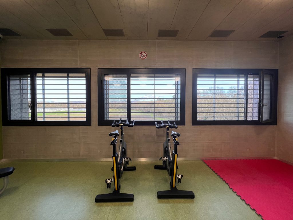Neben den Spazierhöfen mit Ping Pong-Tischen und Raum für Lauf- und Ausdauersport gibt es auch einen Fitnessraum. Insassen im Strafvollzug dürfen zwei Stunden am Tag in die Höfe, in der Ausschaffungshaft sind es 3 3/4 Stunden. Der Fitnessraum steht jeweils maximal 13 Insassen des Strafvollzugs für eine Stunde pro Woche zur Verfügung. Die Geräte sind mehrheitlich auf Ausdauer ausgelegt, Hanteln gibt es keine. «Hanteln sind gefährlich und könnten als Wurfgeschosse verwendet werden», sagt Salzmann. «Ausserdem sind wir ja keine Muckibude.»
