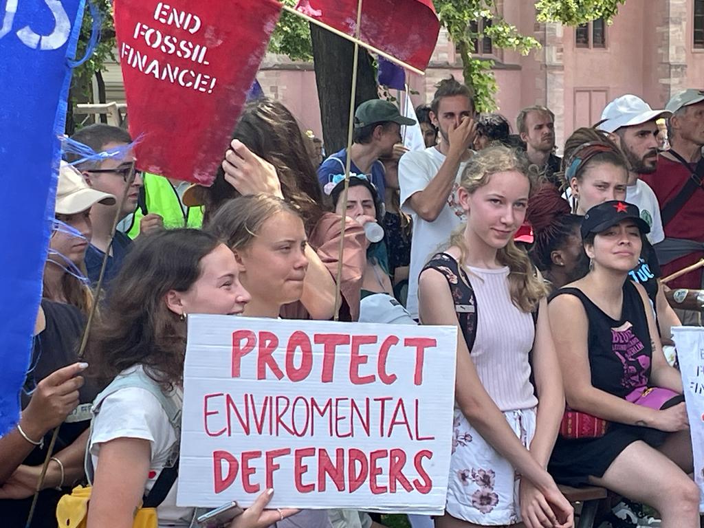 Der heimliche Star der Demonstration will sich an der Demo selbst nicht äussern. Medienanfragen winkt sie ab. Mit einem roten Fähnchen mit der Aufschrift «End Fossil Finance» – Schluss mit der Finanzierung von fossilen Brennstoffen – marschierte die 20-Jährige den grössten Teil der Demonstration im vorderen Teil des Demonstrationzuges mit. Als die Menge bei der BIZ vorbeimarschierte, führte Thunberg die Kundgebung für kurze Zeit zuvorderst sogar lauthals an.