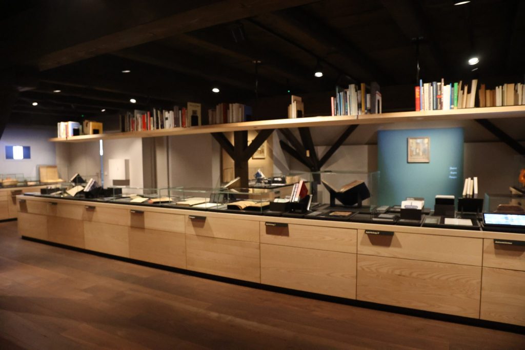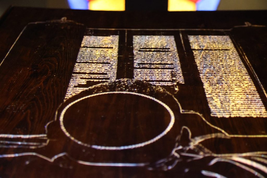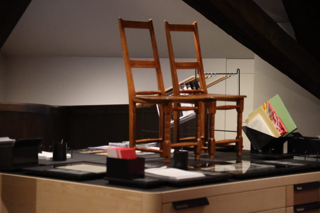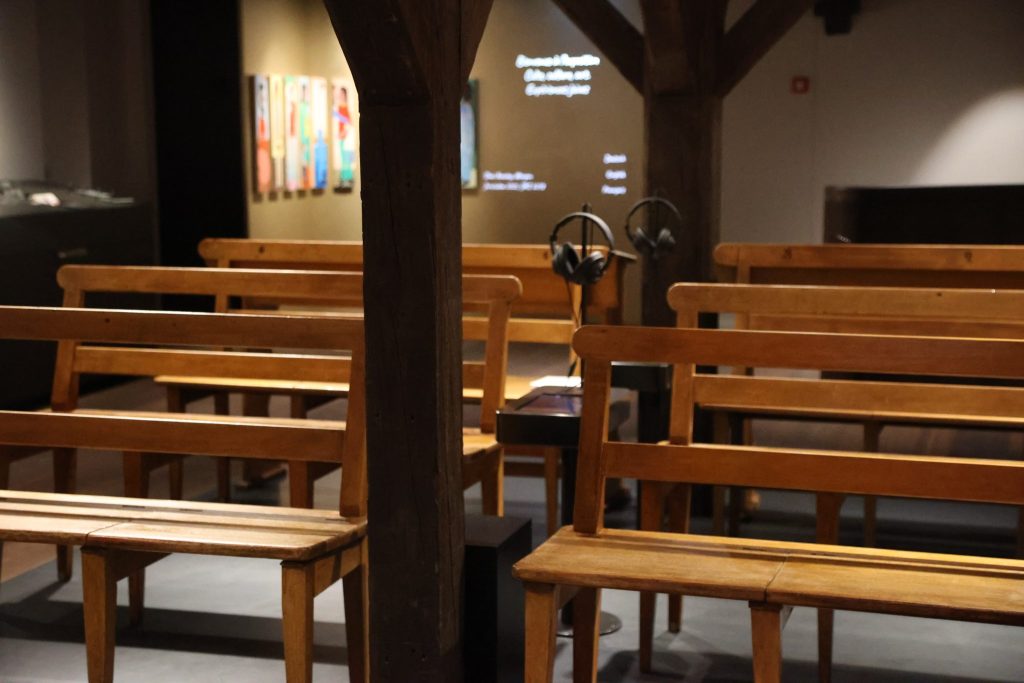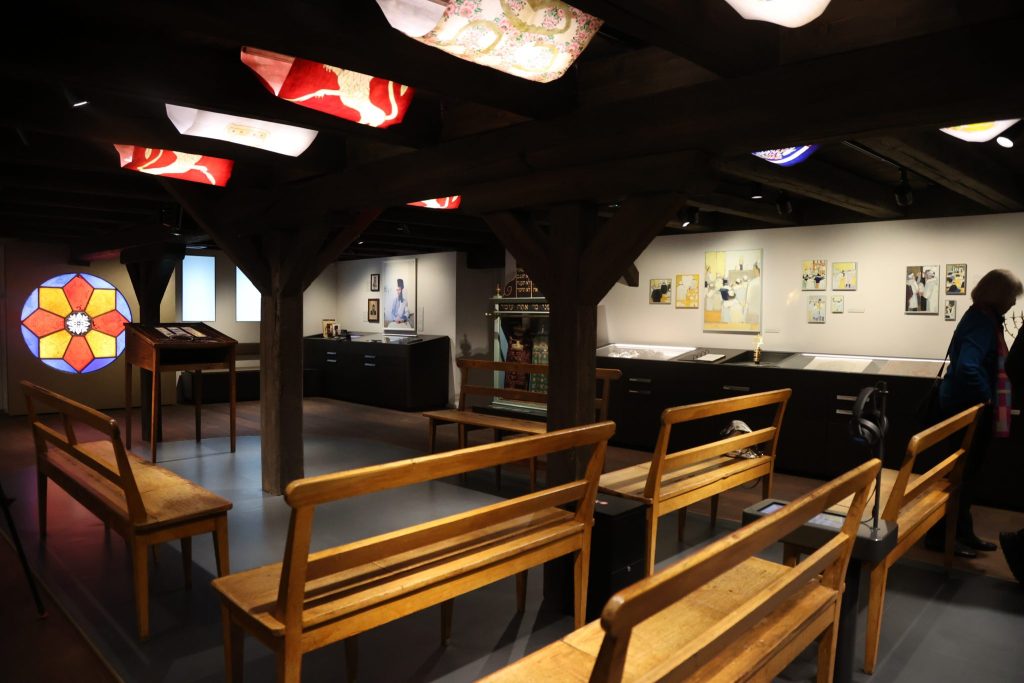 Die Dauerausstellung erstreckt sich über zwei Stockwerke, mit verschiedenen Objekte: von einem Betsaal bis hin zu einem Tisch der Liebe mit zwei Hochzeitsstühlen.