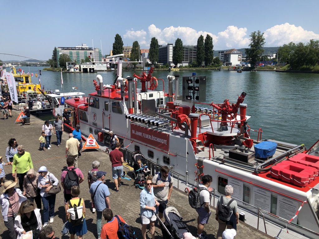 Ebenfalls Geburtstag, und erst noch einen runden, feiern zwei Schiffe. Die beiden Feuerlöschboote der Kantone Basel-Stadt und Baselland zeigen sich am Hafenfest der breiten Öffentlichkeit. Sonst sind sie zum Glück nicht oft zu sehen, fahren sie doch nur im Notfall den Rhein auf und ab. Seit 50 Jahren stehen sie im Dienst der Berufsfeuerwehr. Pro Jahr rücken sie rund 40 Mal aus.