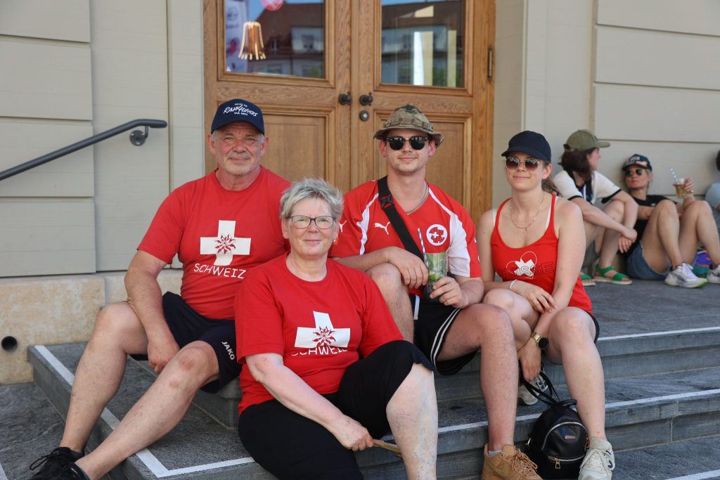 So geht es auch einer Familie aus Stein am Rhein (SH). Zufrieden sitzt sie auf der Treppe des Stadtcasinos, wo es schattig ist und eine leichte Brise um den Nacken weht. Die Vorfreude steht den Eltern und den zwei Kindern ins Gesicht geschrieben. Sie besuchen zum zweiten Mal ein Spiel der Frauen-Nati im Stadion. Dass noch nicht so viele Fans versammelt sind, nehmen sie gelassen. «Es ist noch früh», sagt der Vater André. Es lebe sich trotz hoher Temperaturen «gut», ergänzt Sohn Sandro und hält seinen Becher mit einem eisgekühltem Mojito hoch. Hitze hin oder her, sie fiebern dem Nati-Spiel am Abend entgegen.