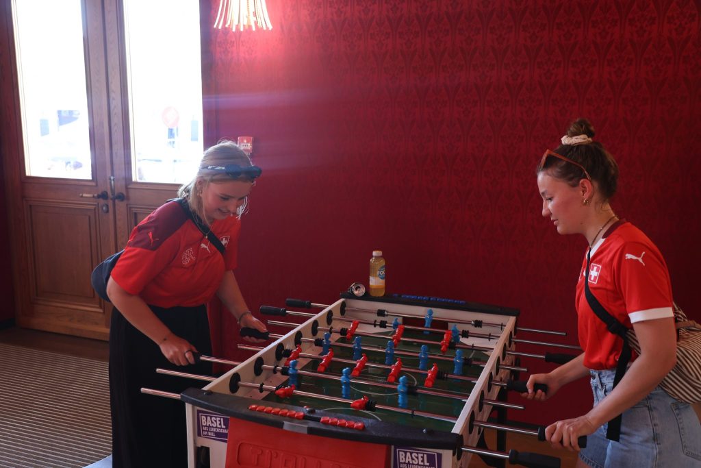 Das tun auch Lea und Hannah aus Zeglingen. Wegen der Hitze sind sie ins kühle Stadtcasino geflüchtet und vertreiben sich die Zeit am Töggelikasten. «Gegen Abend kommen bestimmt noch mehr Leute», ist sich Hannah sicher. Nur verhalten optimistisch ist Kollegin Lea, wenn es um den Resultattipp fürs Spiel gegen Norwegen geht: «Ich glaube, es geht 1:1 aus – oder wenn es gut kommt, ein glückliches 2:1». Hannah traut der Nati nur ein Unentschieden zu. «Aber vielleicht überraschen sie ja…».