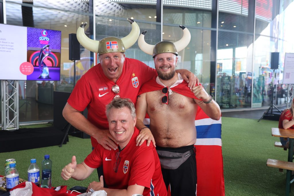 Die gute Laune muss man bei den norwegischen Fans ebenfalls nicht suchen. Wir treffen Tomas in der Fanzone am Messeplatz. Bei bester Stimmung sitzt der Norweger zusammen mit Landsleuten an einem Festbank und trinkt Bier. Wegen der Hitze hat er das T-Shirt gleich weggelassen, eine Norwegen-Flagge und ein Plastikhelm mit Wikingerhörnern muss reichen.