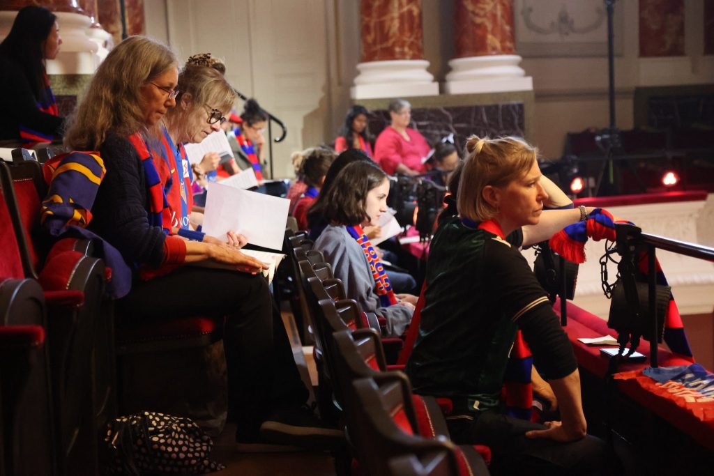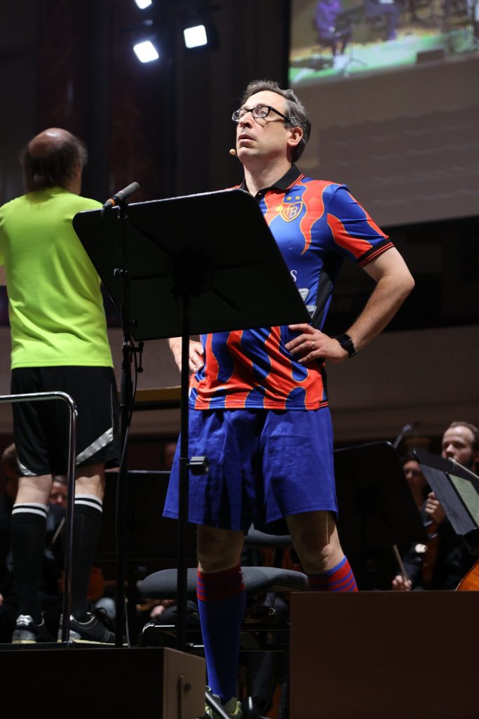 So hast du das Stadtcasino vermutlich noch nie erlebt: Solistinnen und Solisten tragen Trikots und Stulpen statt edler Roben und Frack. Der Dirigent schwingt den Stab, mit neongelbem Shirt und Trillerpfeife – als Schiedsrichter. Flankiert wird er vom Chor, der in rotblauen Schals eher an die Muttenzerkurve erinnert. Und im Hintergrund zeigt eine riesige Leinwand eine Live-Übertragung des Geschehens auf der Bühne. Kurzum: Das Stadtcasino mutiert zum Fussballstadion.