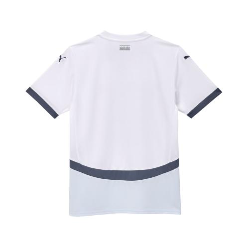Das Auswärtstrikot kommt in blau-weiss daher. Es sei vom Jungfraujoch inspiriert, so der SFV: «Die Verbindung zu Schnee, Bergen und Eis findet sich in den blauen Akzenten des Trikots wieder, während die Grafik gemusterter Linienverläufe auf die Schienenschwellen der Jungfraubahn abzielt.»
