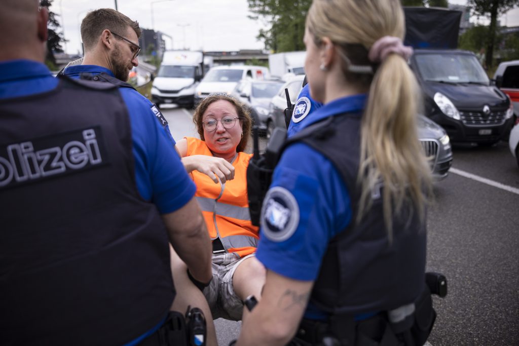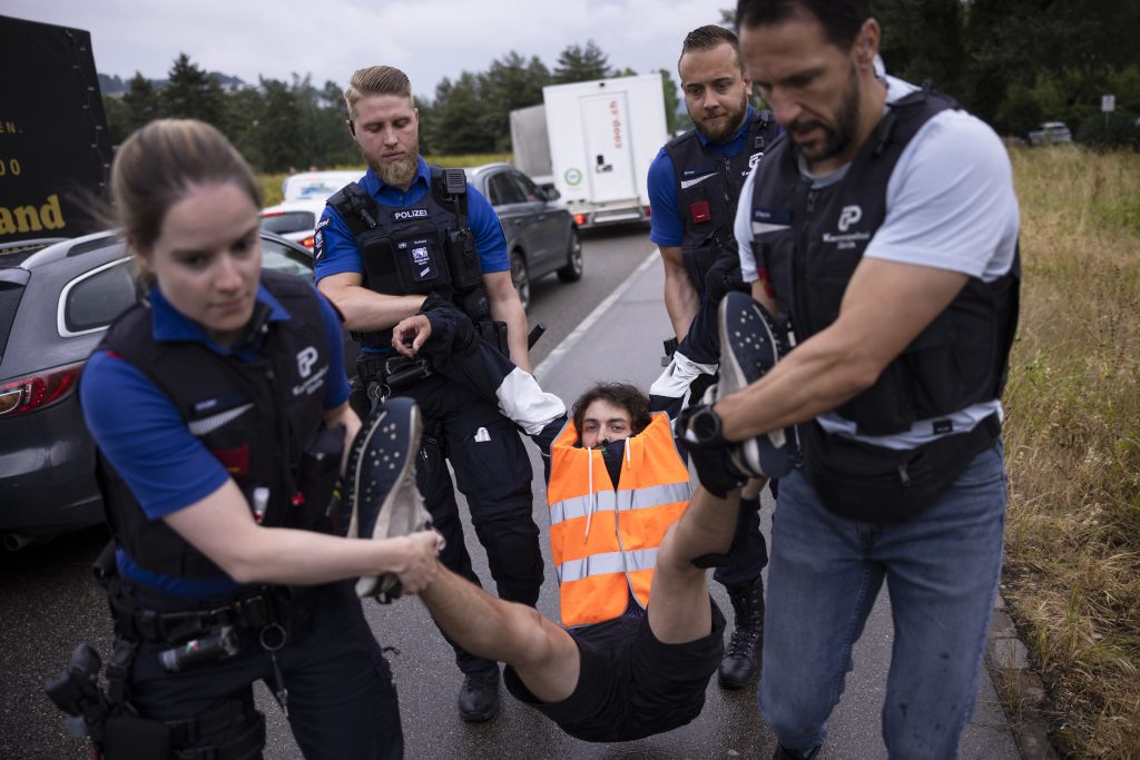 Insgesamt sieben Aktivistinnen und Aktivisten blockierten die beiden Ausfahrten für je rund eine halbe Stunde. Einige von ihnen klebten sich mit Sekundenleim auf dem Asphalt fest, so dass Polizeimitarbeitende sie mit Fett ablösen mussten.