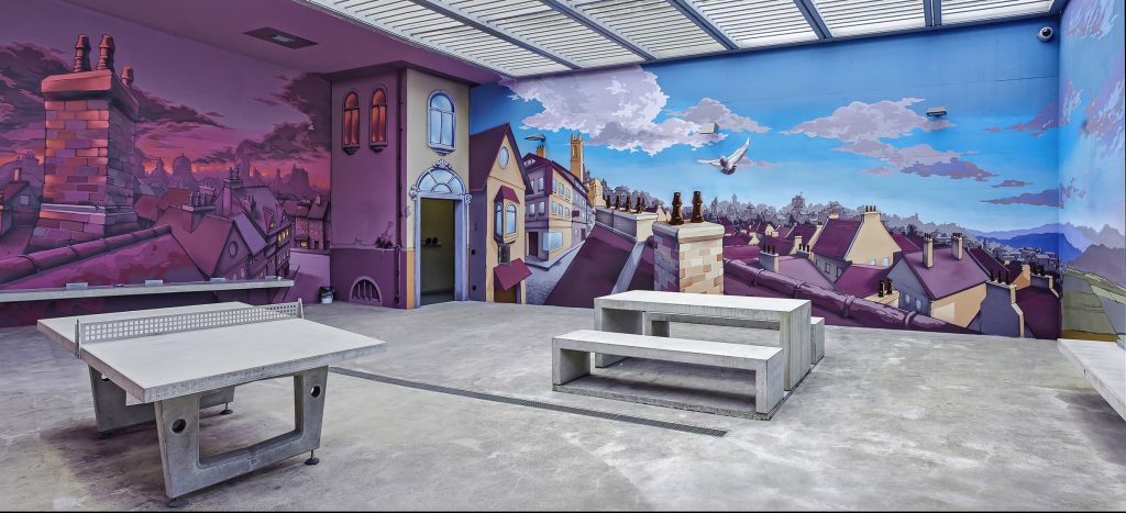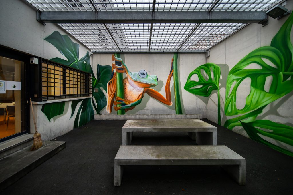 4’661 Quadratmeter Beton. Das sind etwa 17 Tennisplätze, zehn Basketballplätze und etwas mehr als ein halbes Fussballfeld. Das Grau ist in der JVA Lenzburg der Farbe gewichen. 4’661 Quadratmeter Beton sind heute 4’661 Quadratmeter Kunst.