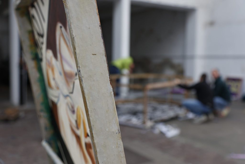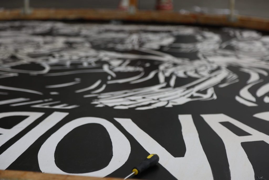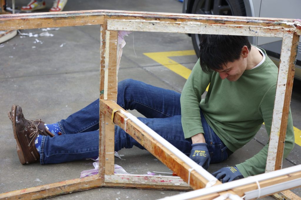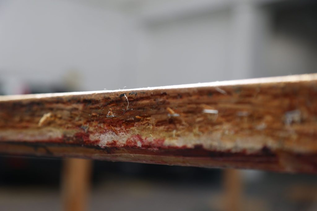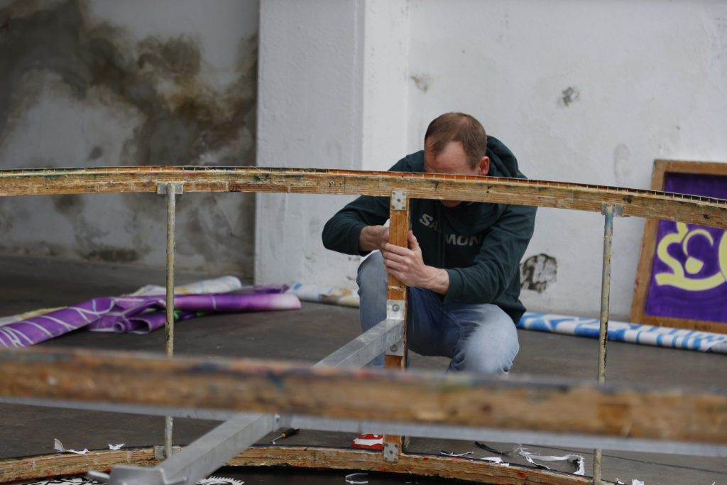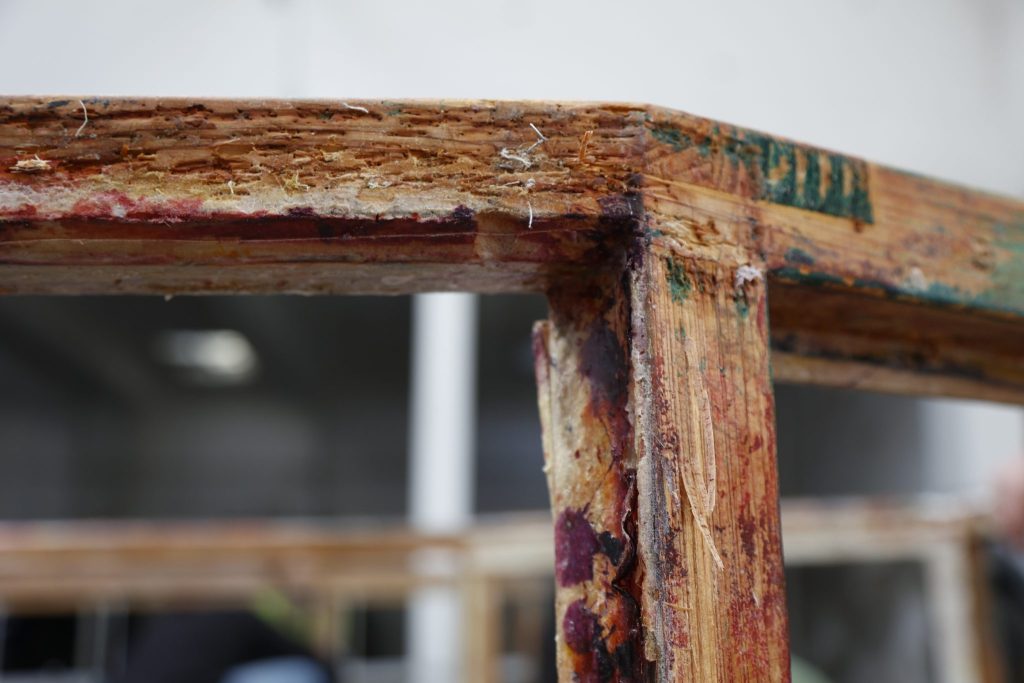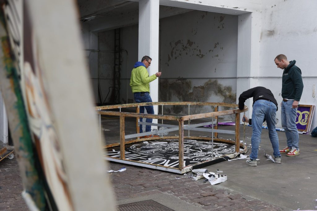 Nicht nur die Abbau-Crew ist schon lange bei der Fasnacht mit dabei. Die Gestelle, auf denen die Leinwände gespannt sind, sind beide über 20 Jahre alt. «Das Gestell war noch vor mir in der Clique» witzelt einer. Den Holzgestellen sieht man ihre lange Nutzung an. Überreste von Leim, Farbspuren, Rissen, spröden Löcher und abgenutzten Kanten sind zu sehen.