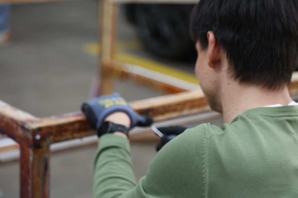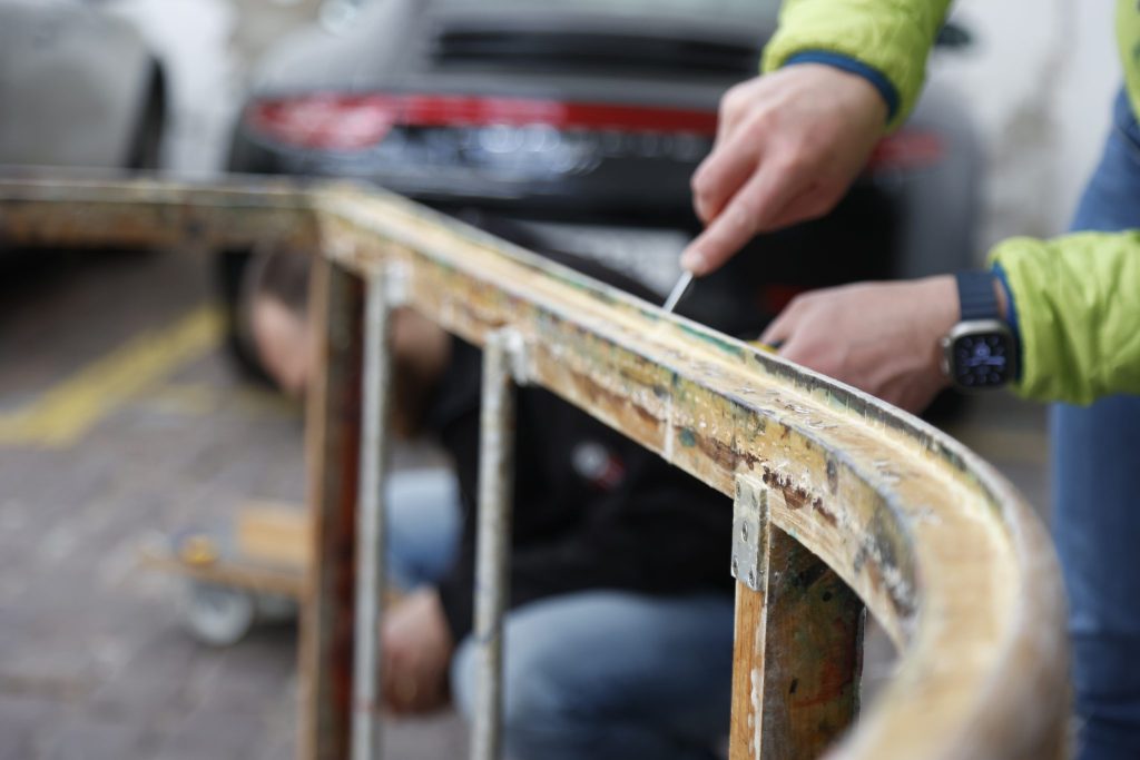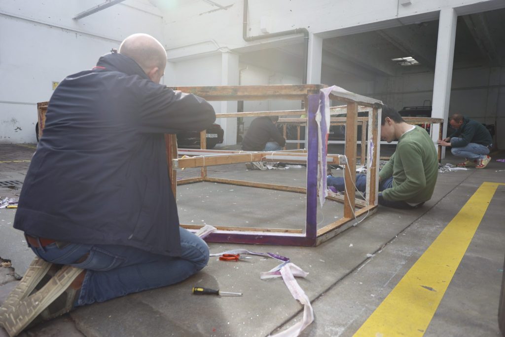 Genau während dieses Prozesses stossen wir zu den Arbeiten. Begrüsst von Seufzen und Schimpfwörtern gegen das Holz, die Tackerklammern, die Werkzeuge oder was sonst noch im Sichtfeld war. Bei der Frage, ob man sich schon am Donnerstagmorgen vor der Arbeit grault, heisst es: «Man weiss, dass es kommt und stellt sich darauf ein. Es ist zwar nicht toll, aber man muss es machen.» Trotzdem, bei der Aussicht, hunderte von Klammern aus dem Holz zu zerren, ist kaum jemand begeistert.