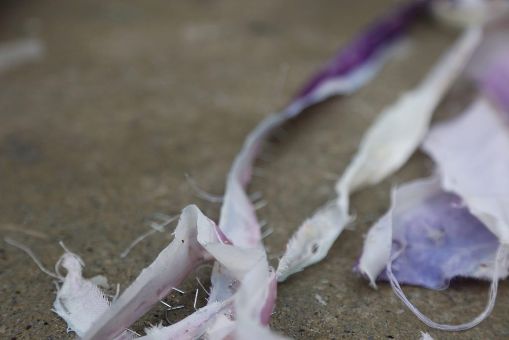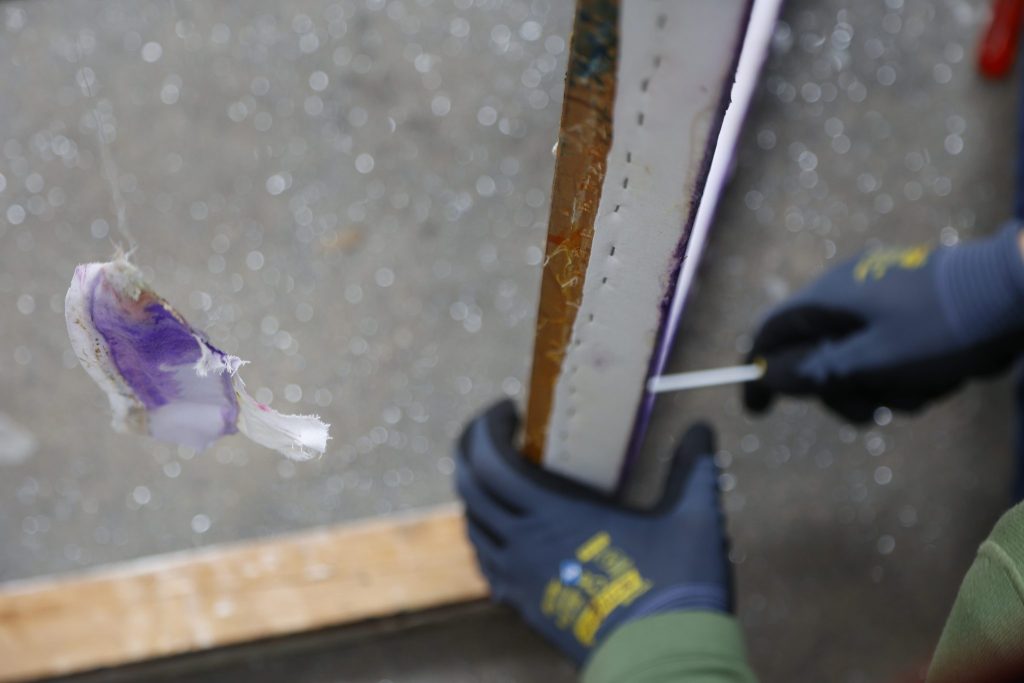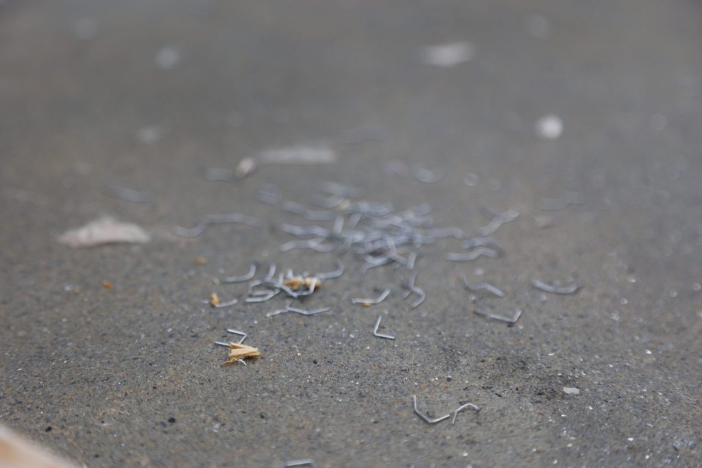 Auch wenn die Arbeit mühsam sei, hätte es noch anstrengender werden können. Weil es geregnet hat, ist das Holz feucht und die Büroklammern lösen sich etwas einfacher. Nichtsdestotrotz: Es bleibt ein Kraftakt.