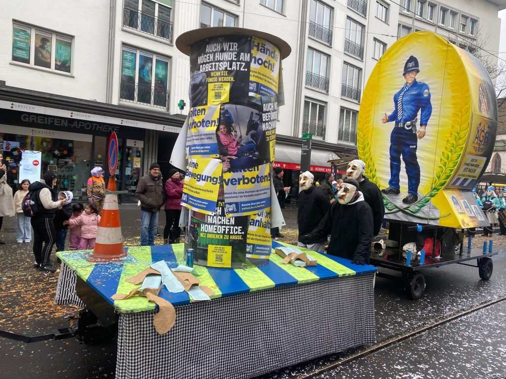 Die aktuelle Misere der Basler Kantonspolizei wird während den «drey scheenschte Dääg» besonders prominent aufgegriffen. Gleich mehrere Formationen widmen sich mit ihrem Sujet dem Thema, das in den vergangenen Monaten immer wieder für Schlagzeilen sorgte. Angeprangert werden vor allem die Probleme mit Personalmangel, hohe Krankheitsstände und die Kritik an der Einsatzplanung. Mit spitzer Zunge und kreativen Wortspielen nehmen die Formationen die Verantwortlichen ins Visier und machen ihrem Unmut auf humorvolle Weise Luft.