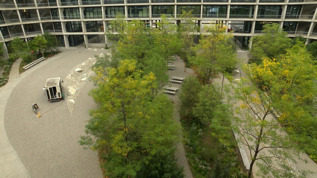 Der «Campus», nicht das Bürogebäude, wie die Entwicklerin den Komplex nennt, sei extra auf Begegnungen ausgelegt. «Man kann in unserem Innenhof im Park arbeiten, im Bistro oder Grossraumbüro», so Eisenhut. Die Wände könnten dabei beliebig angepasst werden. Um den Austausch zwischen den Mitarbeitenden und den verschiedenen Gebäuden auf dem Switzerland Innovation Park zu fördern, darauf seien auch die Treppenhäuser ausgelegt worden. «Sie sind ein wichtiger Begegnungsort für die Leute, die hier arbeiten», so Stefan Marbach, Verantwortlicher Herzog und de Meuron.
