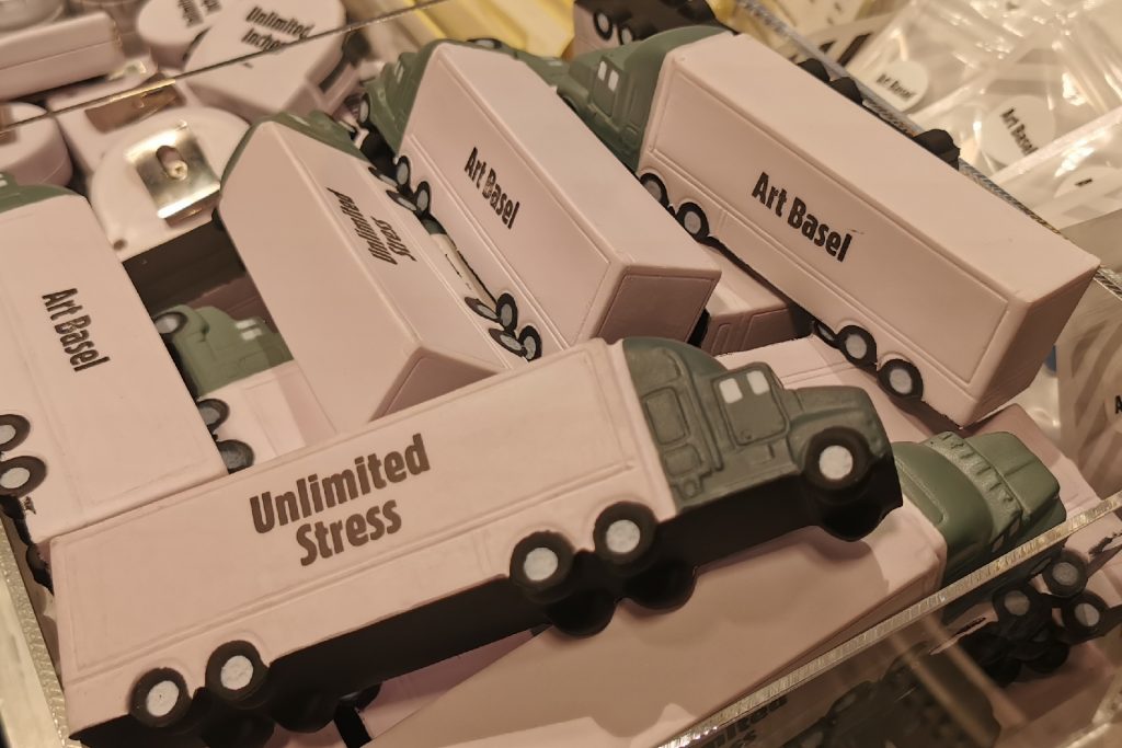 Eine schwarze Tote-Bag mit dem Aufdruck «ART ART ART», ein «Unlimited Stress»-Quetsch-Lastwagen oder Badges mit verschiedenen Aufschriften wie «I went to Art Basel and could only afford this badge» oder «I love it! How much?»: Das alles findest du im neuen Shop der Art. Diesen gibt es in diesem Jahr erstmals an der Art Basel. Zu finden ist er im Eingangsbereich der Messehalle 1. Ein Eintrittsticket für die Art brauchst du für einen Besuch des Shops nicht. Ein Augenschein vor Ort zeigt: Der Shop ist gut besucht.