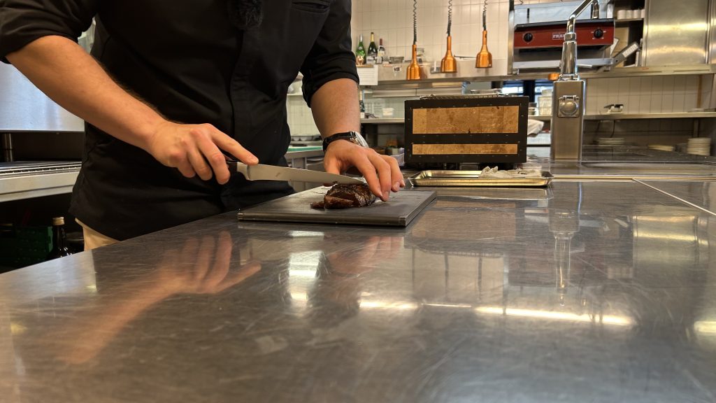 Endlich ist es so weit: Steffen schneidet die Aubergine für uns auf und garniert sie. Das Gemüse sieht mittlerweile Glasig aus, die Oberflächenstruktur ähnelt der Marmorierung eines Stücks Fleisch. Ob er ein Signature-Gemüse habe, wollen wir von ihm wissen.