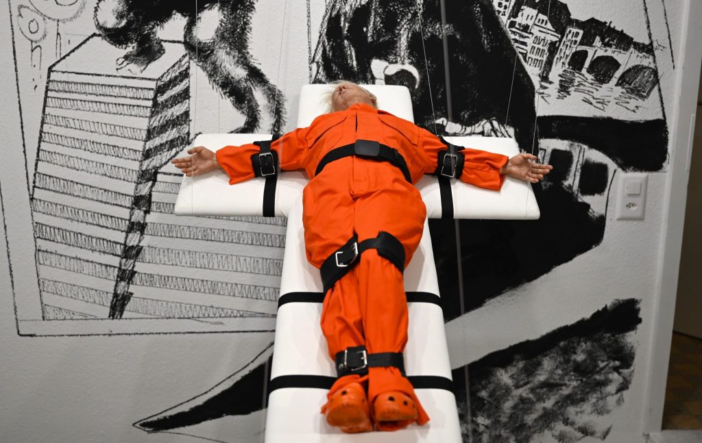 Die Frage ist auch der Grund, warum das Werk in einem 45 Grad Winkel hängt. «Hätten wir ihn aufrecht gehängt, wäre er ein Heiliger gewesen», sagt Breznik. Die Assoziation zum gekreuzigten Trump liege dann nahe. «Wäre er waagerecht, dann wäre die Interpretation zum Verurteilten nahe», erklärt er weiter. Trump ist im Kunstwerk in US-amerikanischer Gefängniskleidung an ein Kreuz geschnallt. Das Kreuz und die Schnallen erinnern an das Bett, auf dem zum Tode verurteilte Häftlinge in den USA die tödliche Spritze verabreicht bekommen. «Hätten wir ihn senkrecht oder waagerecht positioniert, hätten wir eine Vorverurteilung vorgenommen», sagt Konrad Breznik. Diese Entscheidung sollten Betrachtende aber selbst vornehmen.