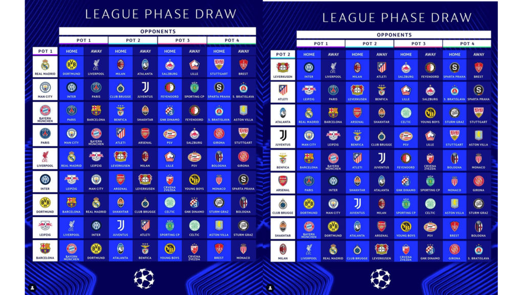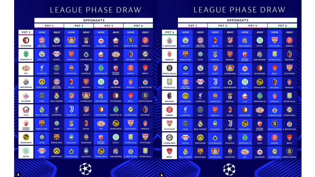 Die Gruppenphase ist nun Vergangenheit: In der neuen Vorrunde kämpfen die Mannschaften in einer grossen Liga um die Plätze in der KO-Phase. Dabei bekommt jeder Verein jeweils zwei Gegner aus vier Töpfen zugelost. Also spielt jede Mannschaft in der Vorrunde acht Spiele gegen acht unterschiedliche Gegner.