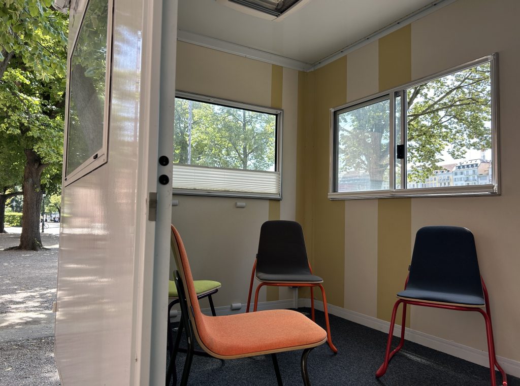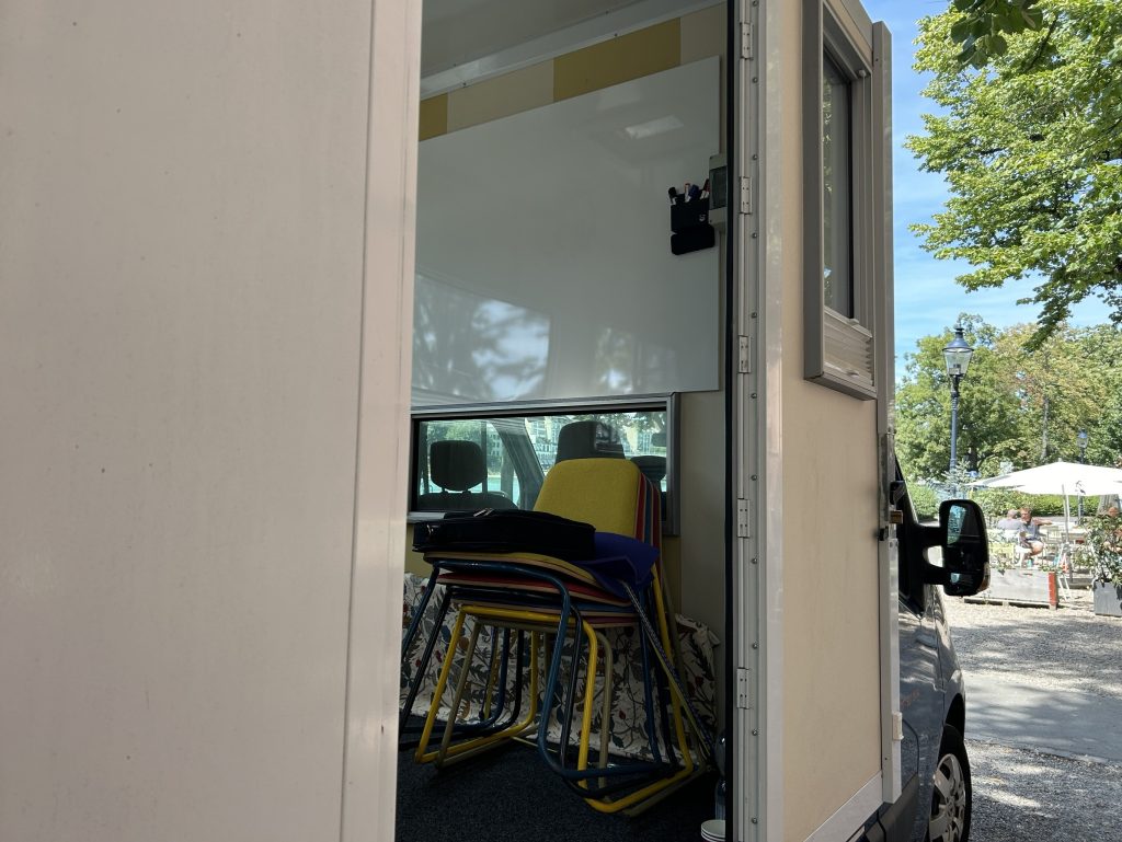 Am Dienstag fuhr sein Mobil zum ersten Mal vor dem Eingang des kHauses vor. Kaum ist die Treppe ins Innere des Fahrzeugs ausgefahren, kann der Unterricht beginnen. Das Miniaturklassenzimmer ist nur wenige Quadratmeter gross und schlicht eingerichtet. Acht Stühle, ein Whiteboard und bunte Filzstifte reichen dem Verein, um hier seit fast sechs Jahren Deutsch zu unterrichten. Das Angebot richtet sich an Geflüchtete, unabhängig von ihrem jeweiligen Aufenthaltsstatus.