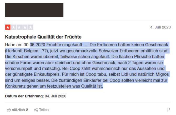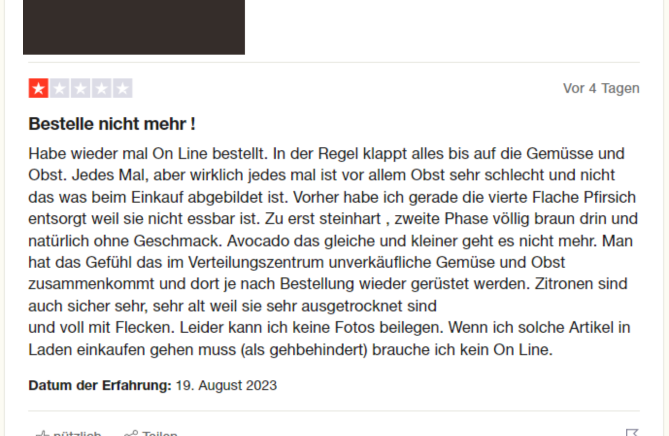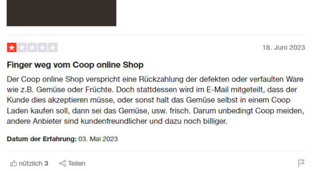 Die Beschwerden über die Qualität der Früchte von Coop gehen derweil auch online ein (teilweise sind sie schon mehrere Jahre alt, teilweise aktuell). Auf Google finden sich mehrere negative Bewertungen. Nicht nur in der Filiale selbst soll es zu Problemen mit der Frische der Früchten kommen, sondern auch im Online-Shop. Hierbei ist anzumerken, dass den Bewertungen nicht klar zu entnehmen ist, in welcher Zeitspanne die Lebensmittel verdorben sind.