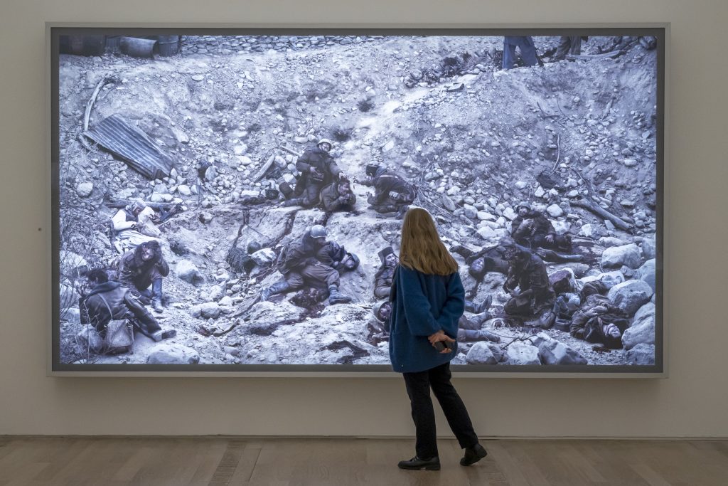 Ganz anders der Eindruck, den das fotografische Historienbild «Dead Troops Talk» von 1991/1992 hinterlässt. Zu sehen ist eine Horrorvision nach einem Anschlag auf eine Patrouille der Roten Armee in Afghanistan im Jahr 1986. Jeff Wall belässt es nicht bei der Darstellung der getöteten Soldaten, sondern lässt diese als Zombies böse lächelnd und mit ihren Fleischfetzen spielend weiter existieren.