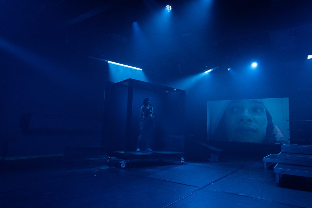 Abwechselnd betreten die vier von Zeit zu Zeit einen Glaskasten, der zuvor in die Mitte gerollt wurde. Eine Art Safespace, in dem sie jeweils eine kurze Geschichte aus dem Nachtleben erzählen, von erhaltenen Körben über Kotzanfälle bis hin zu Verfolgungen durch dunkle Gestalten ist alles dabei. Die erzählten Geschichten stammen alle aus Interviews, die die Verantwortlichen im Vorfeld mit Leuten in Clubs geführt haben, wie uns die Dramaturgin Ann Mayer vor der Vorstellung verrät.