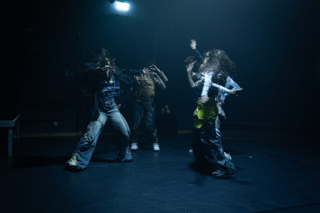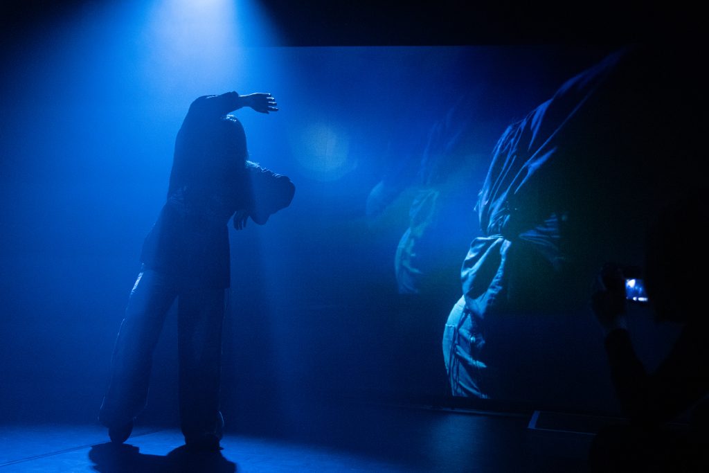 Nach einigen Minuten stellt sich der DJ (verkörpert von Mirco Joao-Pedro) mit seinem Pult an die Seite des Raumes. Vier Gestalten, die sich zuvor unter das Publikum gemischt haben, setzen sich in Bewegung. Via Live-Kamera erscheint plötzlich das Gesicht einer der vier Performer:innen auf den Leinwänden, während sich die anderen weiter durch den Raum bewegen.