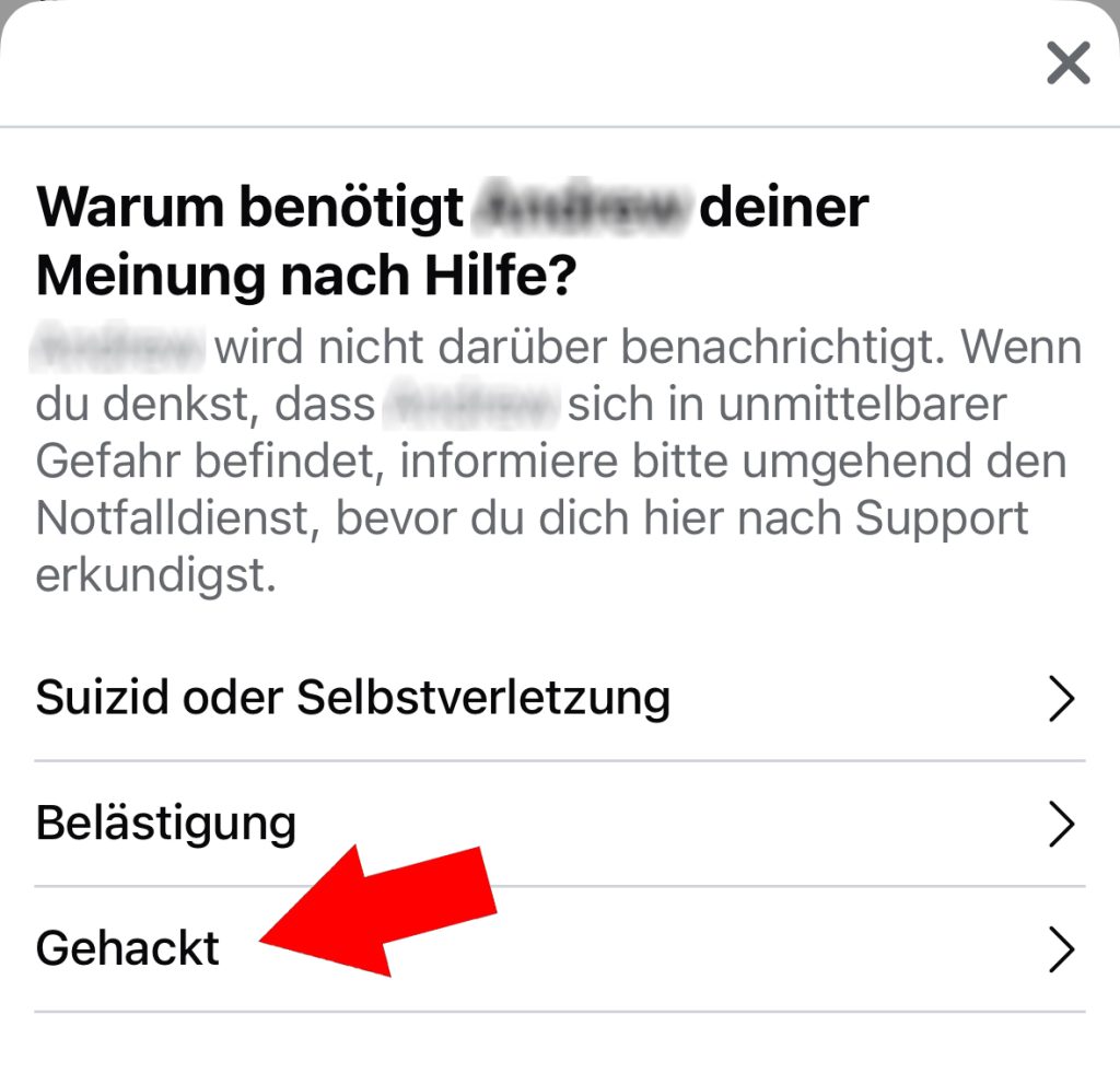 Facebook hat für solche Fälle – zumindest in der mobilen Version – eine Funktion eingerichtet, mit der gehackte Profile gemeldet werden können. Dazu klickst du bei dem betroffenen Profil auf die drei Punkte, dann auf die Kategorie mit dem Herz «Anton helfen» (bzw. den Vornamen der betroffenen Person) und schliesslich auf die Funktion «Gehackt».