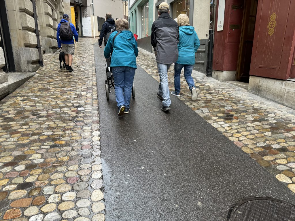 Die neuen Pflastersteine, die die Freie Strasse schmücken, mögen vielleicht optisch überzeugen, für Sehbehinderte sei der neue Boden aber alles andere als einladend. «Es gibt weder Regenrinnen noch andere Orientierungslinien an denen ich mich in der Freien Strasse orientieren könnte», erklärt Ronny Ramseier den Teilnehmenden.