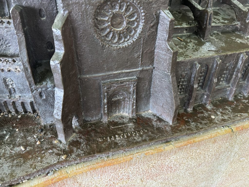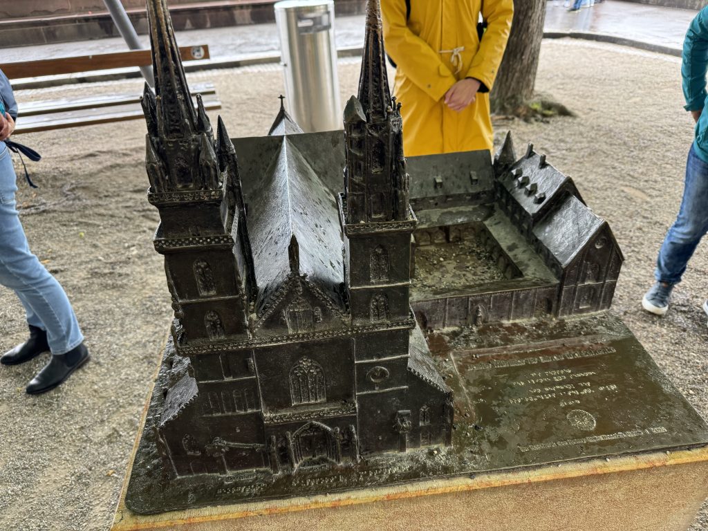 In der Pfalz angekommen zeigt Ronny Ramseier auf das Miniaturmodell des Basler Münsters. Das Modell wurde von Blinden-Stadtmodelle gebaut und soll blinden und sehbehinderten Menschen ermöglichen, das Münster zu ertasten, um ein Gefühl für das Aussehen des Gebäudes zu bekommen.