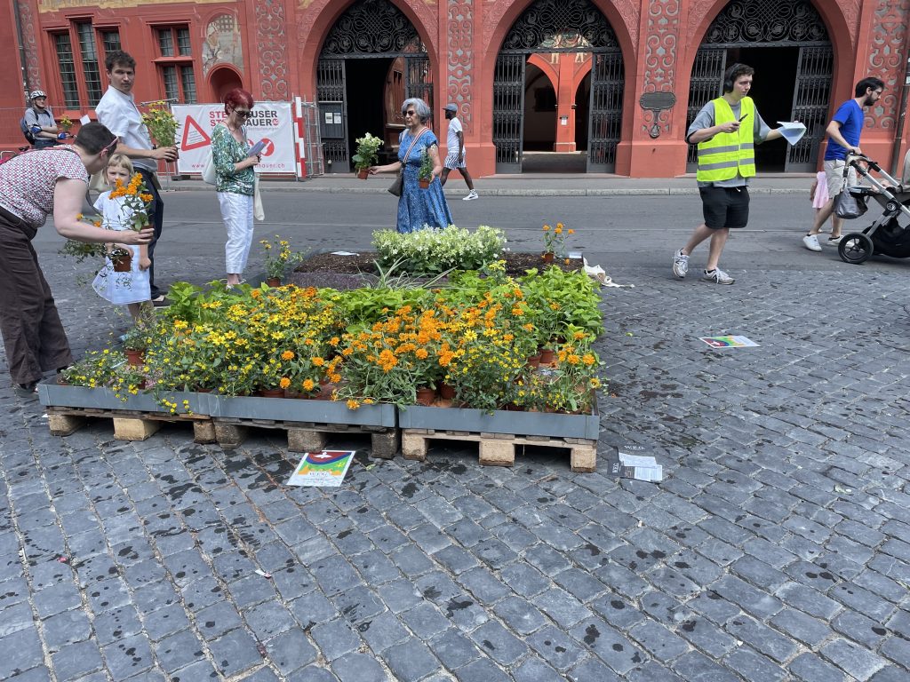 Am Marktplatz angekommen wird aus der Bibel zitiert und gemeinsam gesungen. Es werden Blumen verteilt, die die Teilnehmer:innen auf den Spaziergang mitnehmen.